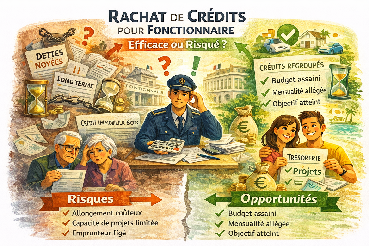 Un regroupement long rigidifie la trajectoire financière. Mutation avec perte de primes, passage à temps partiel, départ en retraite anticipé deviennent plus difficiles à absorber. La dette restructurée devient alors intouchable, car la renégocier une seconde fois est rarement accepté par les banques. Ce verrouillage est peu évoqué, alors qu’il concerne directement les agents publics exposés aux variations de régime indemnitaire.